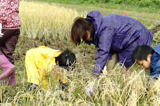 曇り空の中、大人も子ども夢中になって稲の手刈りを体験しました!
